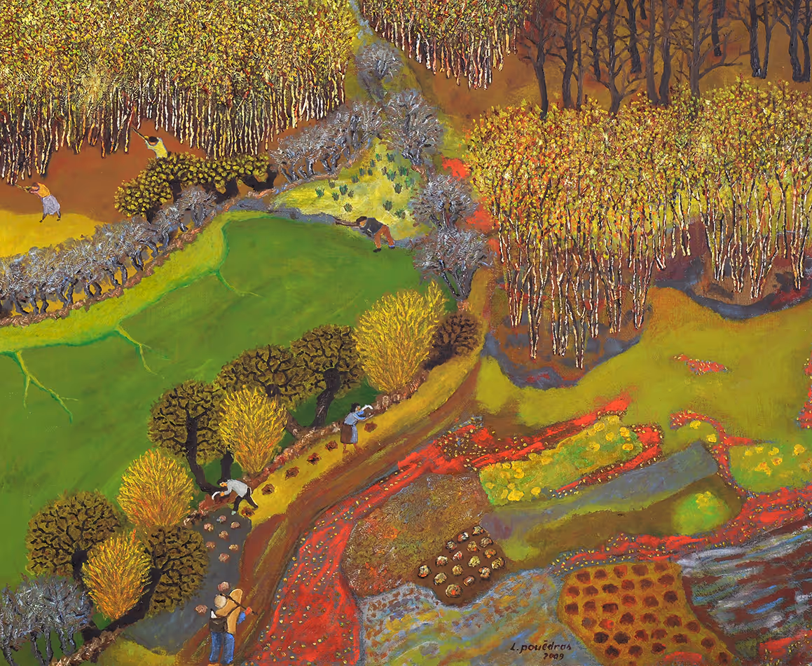 Discrètement, septembre a quitté les dernières journées tièdes de l’été. Octobre, s’est contenté d’afficher ses belles couleurs de l’automne. Novembre, appelé aussi « miz du », ou « kalan gouianv » s’est imposé franchement avec ses brumes, pluies et vent. Le matin, le soleil est timide et les après-midi très courtes. C’est l’hiver qui s’impose. Dans les champs, les parcelles se reposent. Dans les friches et landes c’est l’heure de la litière, fougères, bruyère ajonc, feuilles mortes. Comme la sève est descendue, c’est le moment des fagots. Les villages retrouvent leurs activités de saison. Il faut broyer les pommes, faire marcher les pressoirs et rincer les tonneaux. Du matin au soir il faut nourrir le feu dans les habitations. Dans les étables et remises, il faut broyer l’ajonc, lierre et houx. Le temps ne favorise pas le pâturage. L’hiver est bien là.Miz du : mois sombrekalan gouianv : début de l’hiver