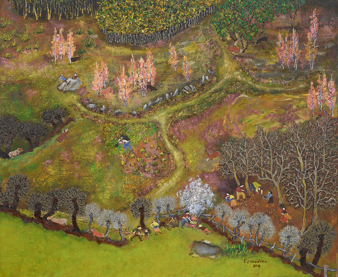 Dans les prairies, les travaux d'hiver sont à peine terminés.Une première neige invite à se dépêcher, l'émondage des chênes est fait. Fagots et branches attendent le passage de la charrette qui les approchera des maisons.Sur le tas de feuilles mortes une brouette est présente, ce qui veut dire que les râteaux et balais n'ont pas terminé leur travail.Dès que la neige disparaîtra, en janvier cette zone humide sera disponible pour accueillir le printemps.