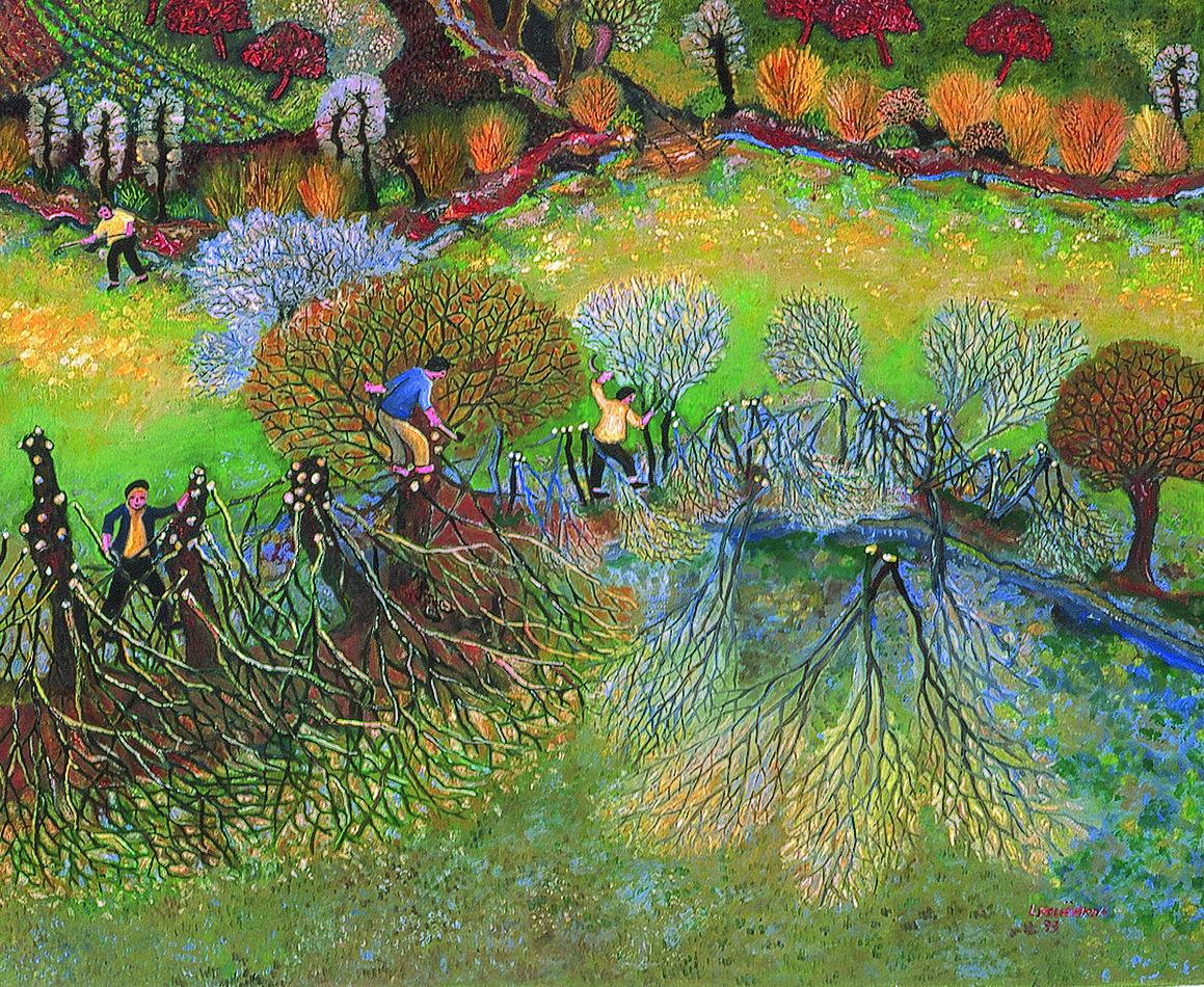Février est proche. Il faut se dépêcher de mettre les prairies en ordre.Une bonne gelée nocturne permet d'approcher les saules et, pour combattre le froid, rien de tel que le travail de la coupe de bois. Dès que les fagots seront façonnés,il faudra les dégager de la zone humide, pour libérer les ruisseaux à remettre en ordre. Le saule taillé en têtard faisait d'excellentes séparations pouvant contenir le bétail tout en laissant passer la lumière si utile pour le foin.Dans la partie supérieure du versant, le long des talus, le ruisseau principal peut être dérivé pour l'irrigation. Début avril, dès que les gelées seront oubliées,le démarrage de la pousse de printemps pourra ainsi être accéléré.