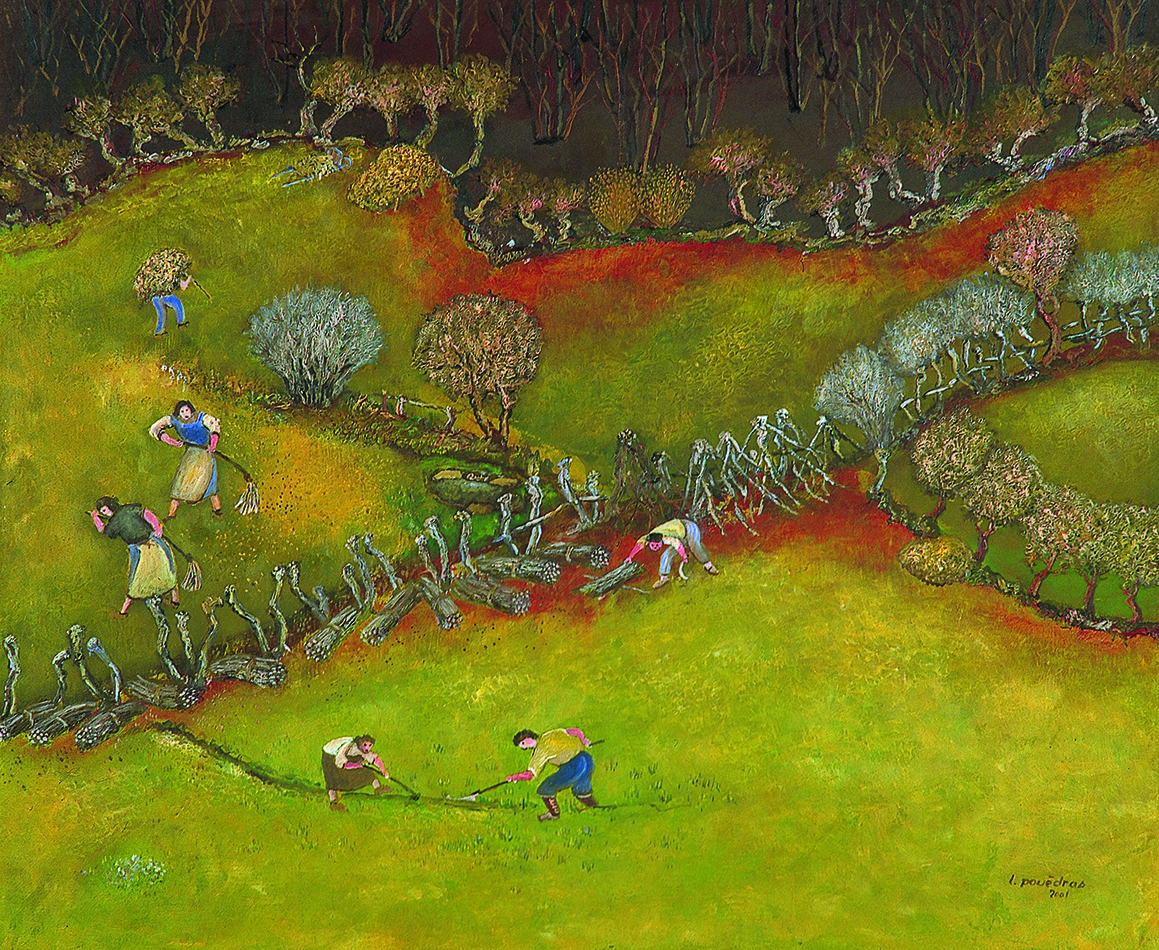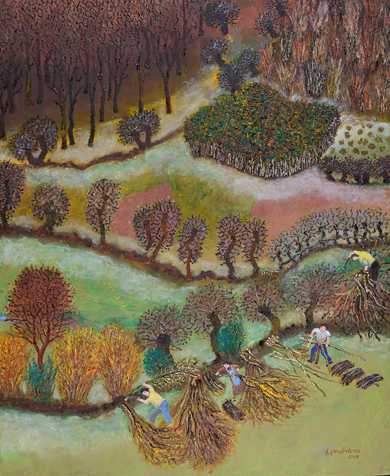 Depuis octobre déjà, les prairies sont laissées à leur sommeil hivernal.Si les gelées nocturnes ralentissent la montée de la sève, le réveil a sonné avec les journées qui s'allongent et le signal donné par les oiseaux.Les saules sont taillés pour mieux laisser passer la lumière à la saison des foins.Les noisetiers, sur les talus, ont abandonné leurs familles aussi il faut balayer, peigner pour laisser l'herbe devenir foin.Les femmes savent bien faire ce travail alors que les hommes plus robustes s'occupent de la taille des arbres, la mise en ordre des clôtures et surtout le creusement des petits ruisseaux devant drainer l'eau dormante.Pour finir, près de l'entrée de la prairie, feuilles mortes, ronces et fougères seront mises dans un tas qui fera une bonne litière pour l'étable.