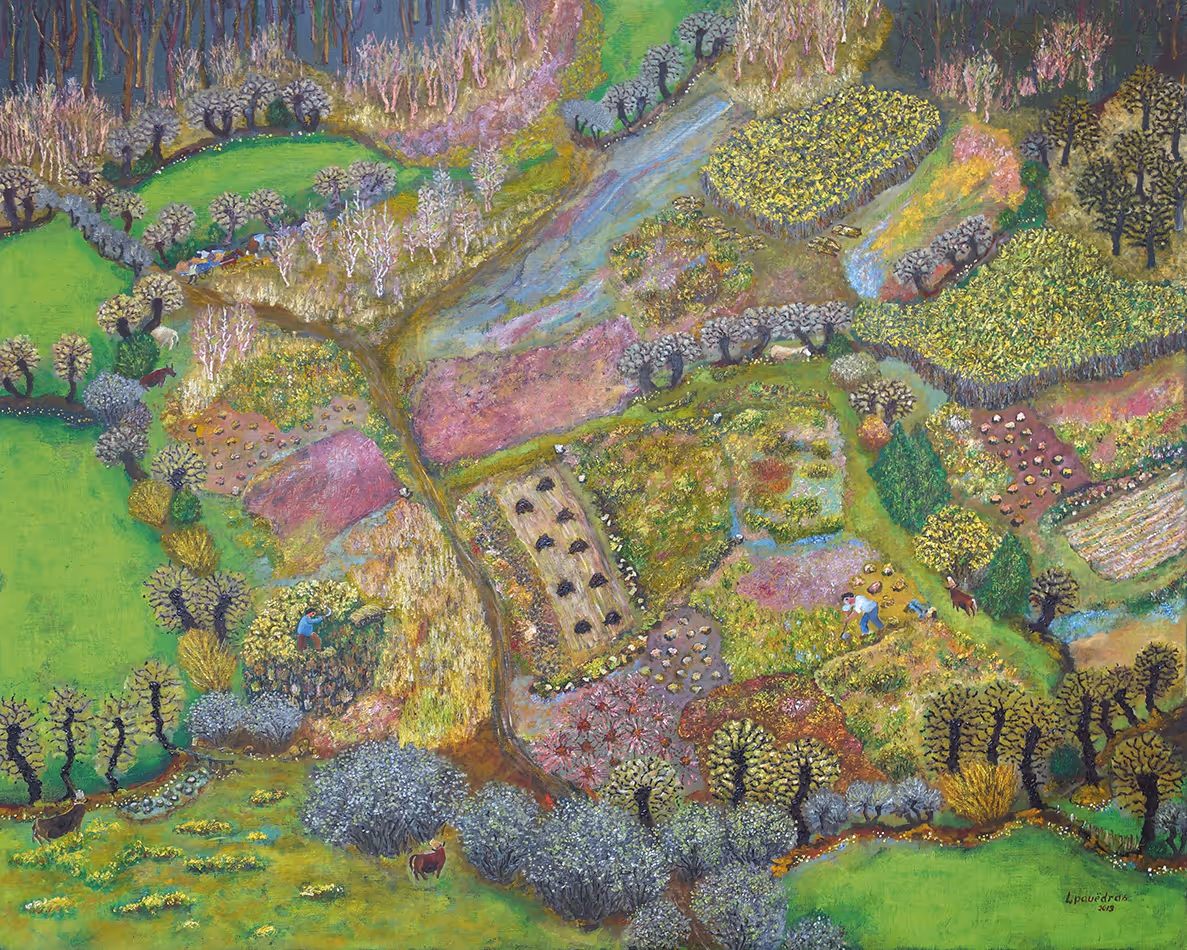 Mars est là ! L’ajonc gorgé de sève est en pleine floraison. Les petites fleurs savent qu’en avril il n’y aura plus de place pour elles. Alors, naturellement, elles se dépêchent d’occuper ces petites surfaces que le bétail a broutées entre les touffes d’ajonc, le long des ornières, et au bord des talus. Pâquerettes, violettes, ficaires, faux fraisiers, mousses, pédiculaires et tant d’autres moins connues semblent s’être données rendez-vous bien à l’abri pour former ici ou là des taches violacées, bleutées ou blanchâtres. Timides, cachées, elles ont raison d’occuper ces petits espaces. Dès les premières semaines d’avril de multiples graminées vont les ignorer pour mieux les recouvrir. Un régal pour les randonneurs qui à la sortie de l’hiver prendront la peine de participer au réveil de la lande. Sur la partie gauche de la toile, une tache brune et orange. Il s’agit d’un chaume qui résulte de la récolte du blé-noir faite en automne.